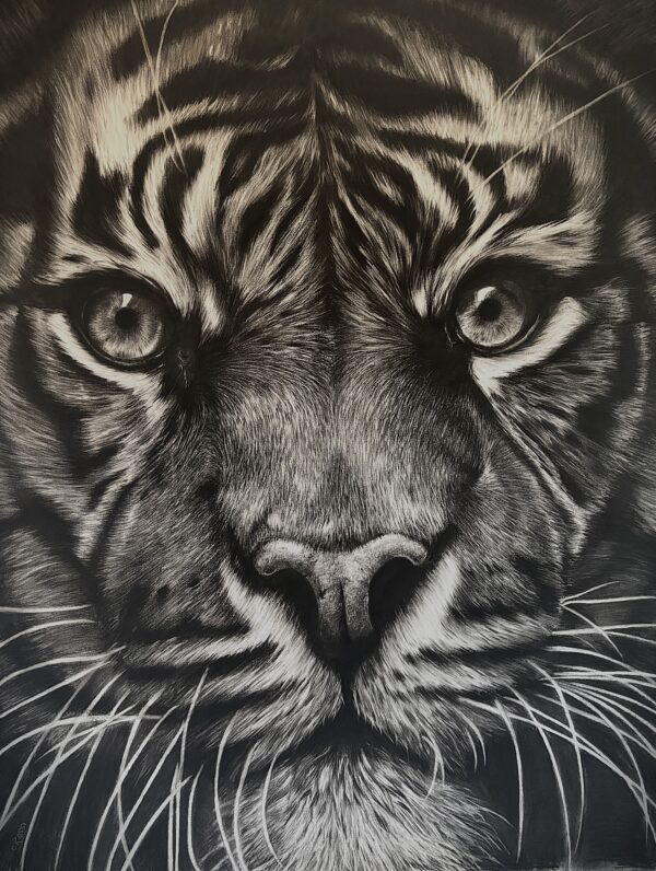 Dessin animalier de tigre «L’affut » réalisé par Chris Rossi, artiste peintre animalière contemporaine