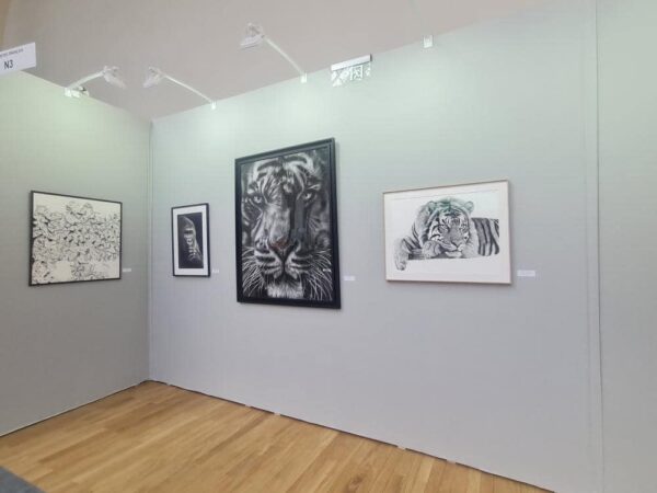 Dessin animalier de tigre « King » réalisé aux Fusains Derwent et Conté Paris sur papier Fabriano.